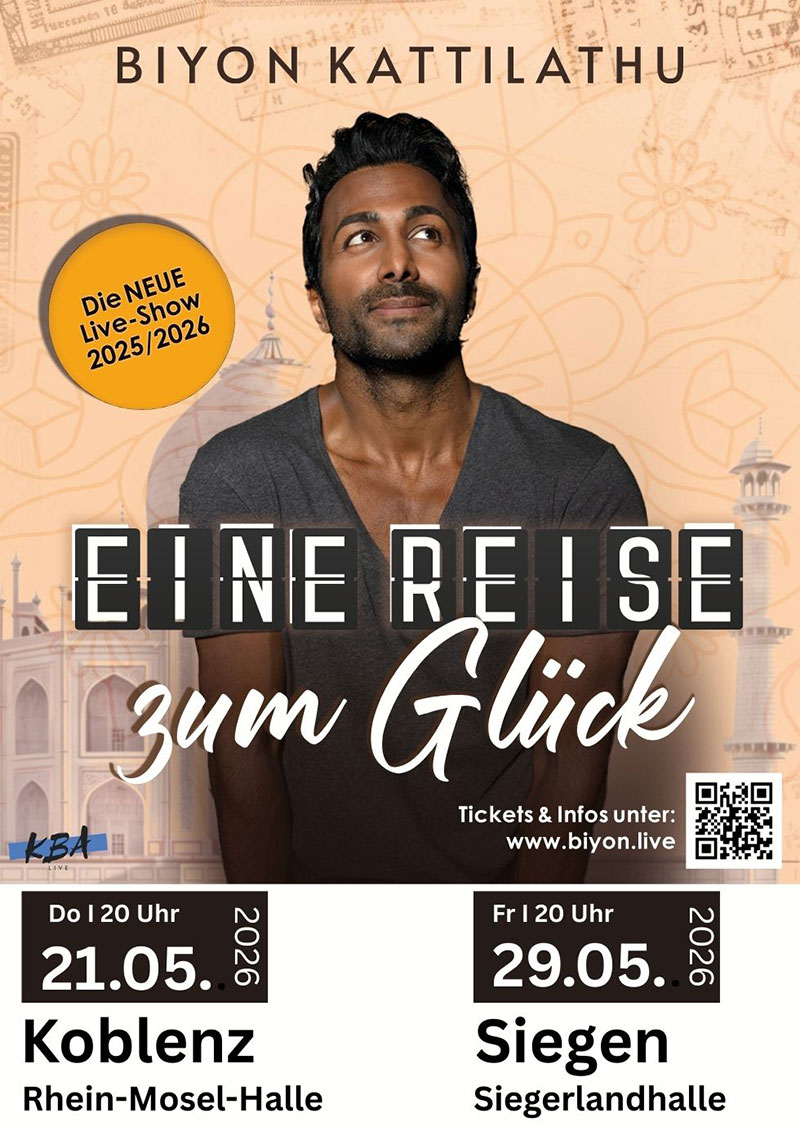 Mit „Eine Reise zum Glück“ präsentiert Biyon Kattilathu ein Live-Programm, das weit über herkömmliche Unterhaltung hinausgeht. Die Show vereint humorvolle Momente mit tiefgründigen, inspirierenden Gedanken und lädt das Publikum dazu ein, eine Reise zu sich selbst anzutreten …