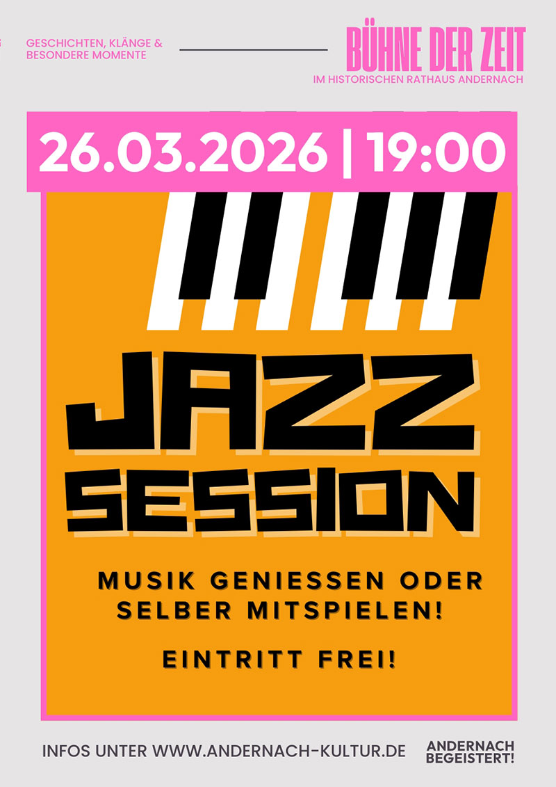 Jetzt neu! In Andernach gibt es ab sofort eine Jazz-Jam-Session. Jeden letzten Donnerstag im Monat können Musiker*innen an der Session teilnehmen. Die Session beginnt mit einem Set der Vorband. Jede Jam Session hat eine andere Vorband. Wir freuen uns auf zahlreiche Zuhörende und Mitspielende …