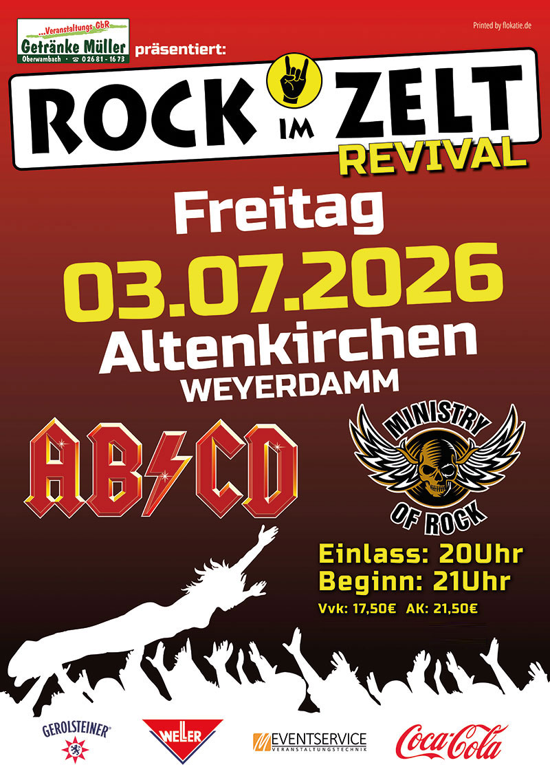 ROCK im ZELT Revival – die Kult-Rocknacht zum Auftakt des Altenkirchener Schützenfestes – geht in die nächste Runde – und weil‘s im vergangen Jahr so grandios war, erneut mit AB/CD als Headliner. Einstimmen auf einer der besten, erfahrensten und erfolgreichsten AC/DC-Tribute-Bands überhaupt wird in diesem Jahr im Vorprogramm die Classic-Rock-Coverband MINISTRY OF ROCK …