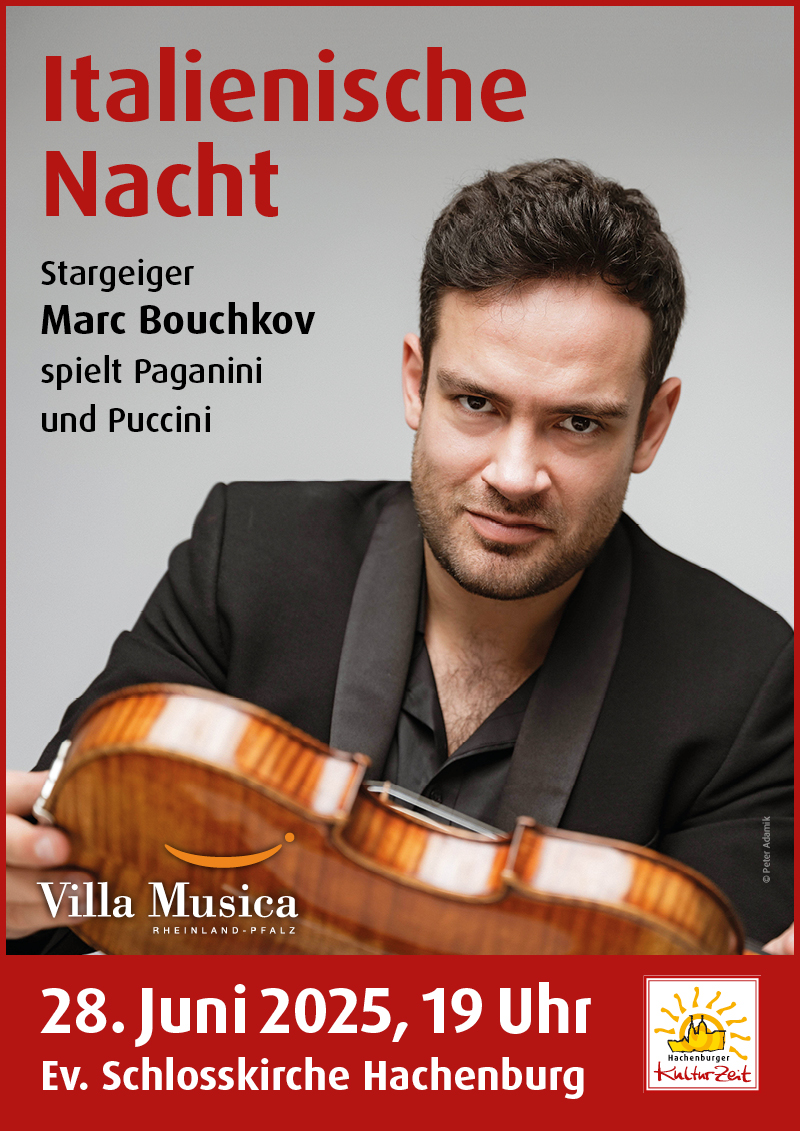 Er war Preisträger beim Tschaikowsky-Wettbewerb in Moskau und beim Königin-Elisabeth-Wettbewerb in Brüssel und lehrt als Professor in Essen, Lüttich und Kronberg. Mit der Landesstiftung Villa Musica ist er seit seiner Studienzeit eng verbunden. In Hachenburg präsentiert Marc Bouchkov vier fantastische junge Streicher aus Italien, Deutschland, Polen und Korea: die Geigerin Giulia Rimonda, der Bratschist Konrad Jacobshagen und die Cellistinnen Oliwia Meister und Seungyeon Baik. Ein Traum von Venedig, Mailand und Florenz in der Hachenburger Schlosskirche.