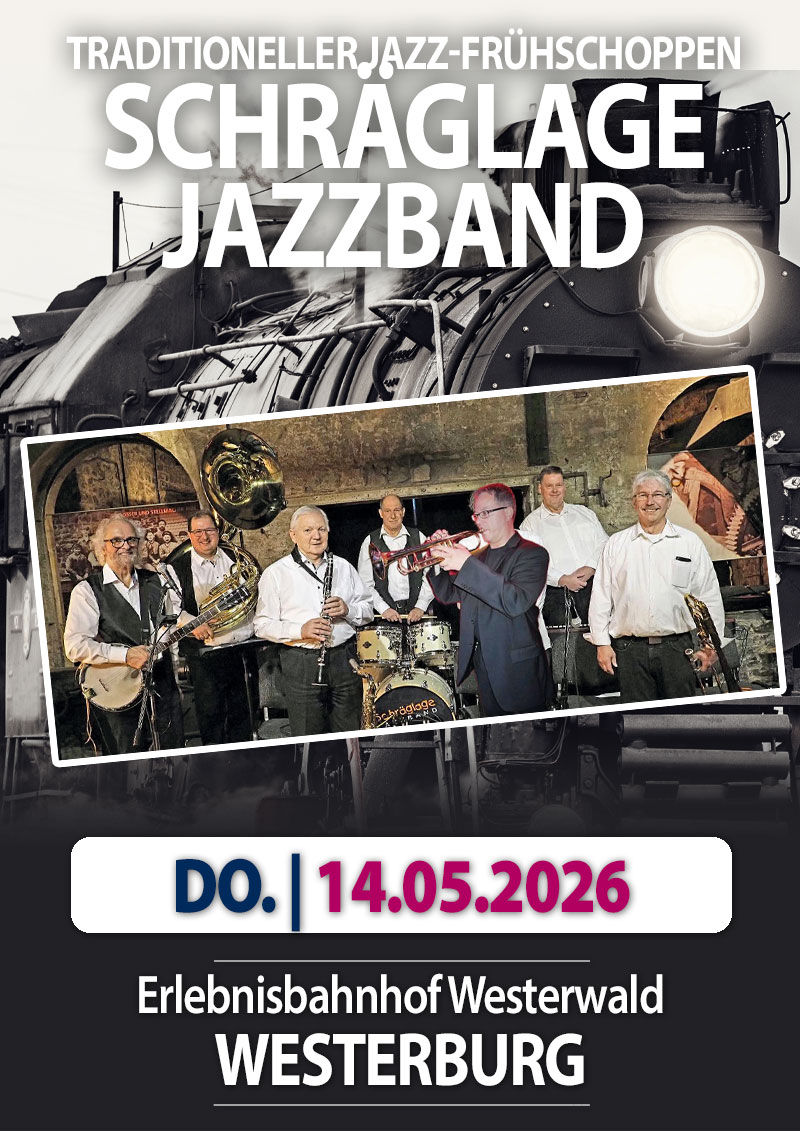 Die Eisenbahnfreunde Westerwald 44 508 e. V. und das Kulturbüro der Verbandsgemeinde Westerburg laden auch in diesem Jahr wieder zum traditionellen Jazz-Frühschoppen an Christi Himmelfahrt in den Lokschuppen des Erlebnisbahnhofes Westerwald in Westerburg ein. Wie sich inzwischen ebenfalls als schöne Tradition etabliert hat, beginnt der Tag bereits um 10:00 Uhr mit einem Gottesdienst der evangelischen Kirche mit Pfarrer Maic Zimmermann …