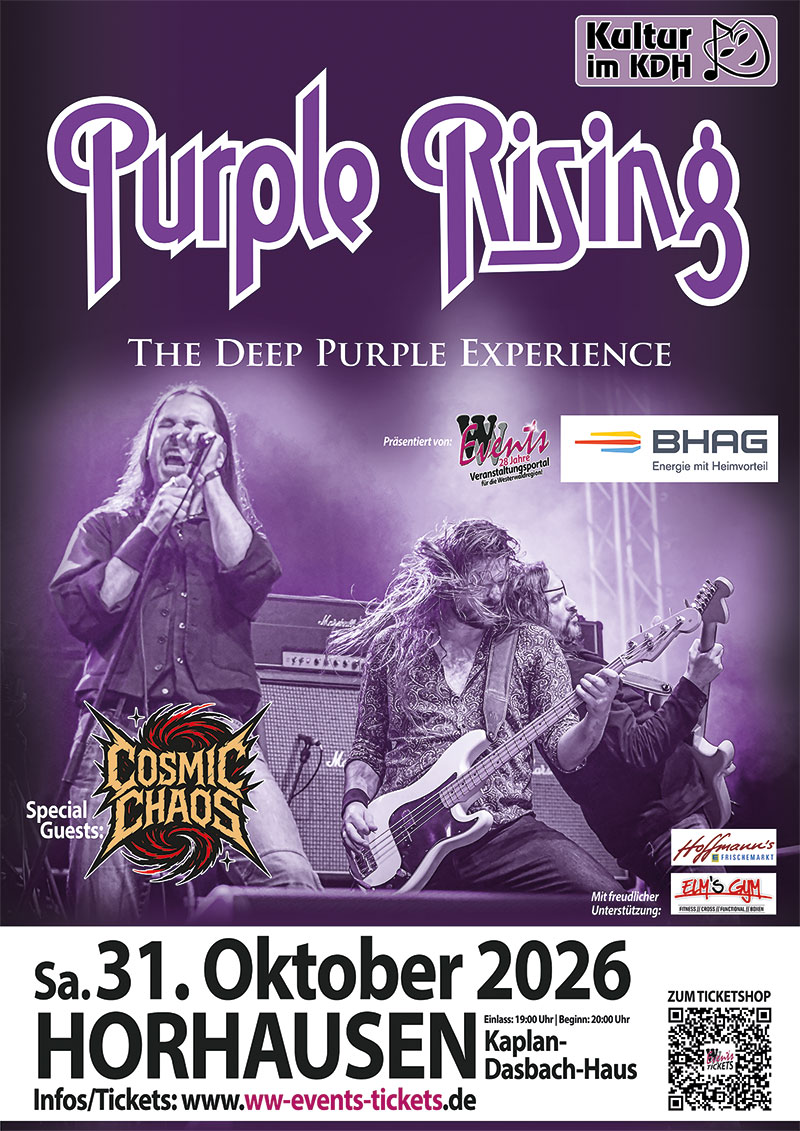 it DIO alive und Special Guests Jigsaw Pieces präsentierte „Kultur im KDH“ im September 2025 erstmals Freunden guter Rockmusik eine fanstastische Rocknacht – und das auch noch sofort bei vollem Haus. Die Begeisterung sowohl beim Publikum als auch bei den Veranstaltern und Unterstützern war so groß, dass man sich kurzerhand entschloss weiterzumachen: Mit Purple Rising konnte eine der besten DEEP PURPLE Tributebands Deutschlands gewonnen werden und mit Cosmic Chaos stellt sich eine frisch gegründete regionale Band vor. Apropos vorstellen: Die Purple Rising Bandmitglieder Andreas König (Hammond & Keyboards)und Dominik Stotzem (Bass) rockten im vergangenen Jahr schon mit DIO alive in Horhausen, genauso wie Cosmic Chaos-Drummer und -Sänger Bernd Grendel, der bei Jigsaw Pieces den Rhythmus angab. Ein Konzertabend an Halloween mit guten alten Bekannten – ganz bestimmt auch im Publikum …