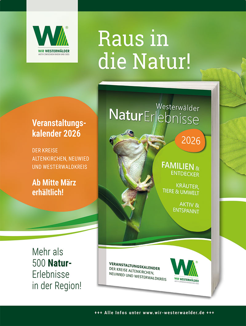 Die Westerwälder NaturErlebnisse 2026 sind kostenfrei erhältlich. Der Veranstaltungskalender kann über die drei Kreisverwaltungen, die Verbandsgemeindeverwaltungen, Tourist-Informationen, Museen sowie weitere touristische Einrichtungen bezogen werden. Zusätzlich steht der Kalender online auf den Webseiten der Landkreise sowie unter www.wir-westerwaelder.de zur Verfügung.