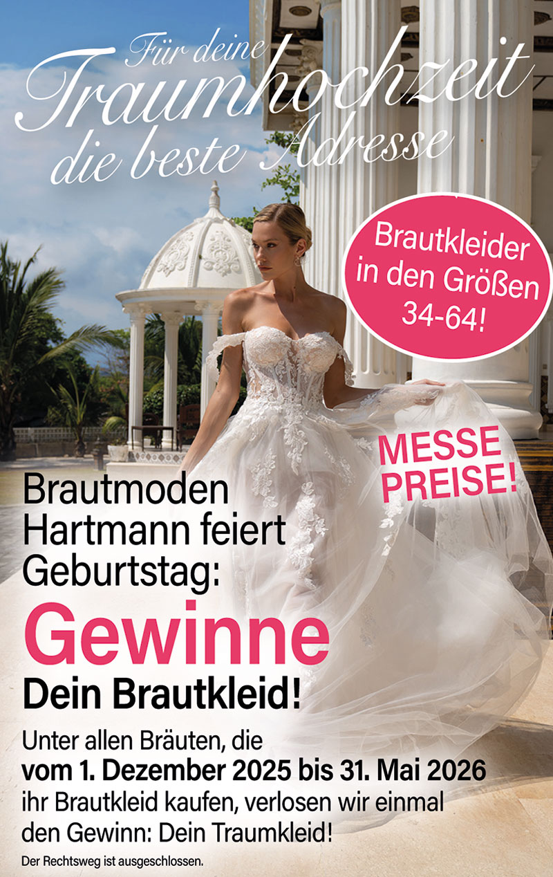 Seit 1992 begleitet Brautmoden Hartmann Bräute auf dem Weg zu ihrem schönsten „Ja“. Über 30 Jahre voller Lächeln, Freudentränen und unvergesslicher Momente – das ist die Geschichte des angesagten Betzdorfer Brautmodenausstatters. Eine Geschichte, die weitergeht – mit ganz viel Herz, Stil und einem Team, das seine Leidenschaft für Brautmode lebt. Als modernes Familienunternehmen in dritter Generation steht Brautmoden Hartmann für Herzlichkeit, Erfahrung und ehrliche Beratung.