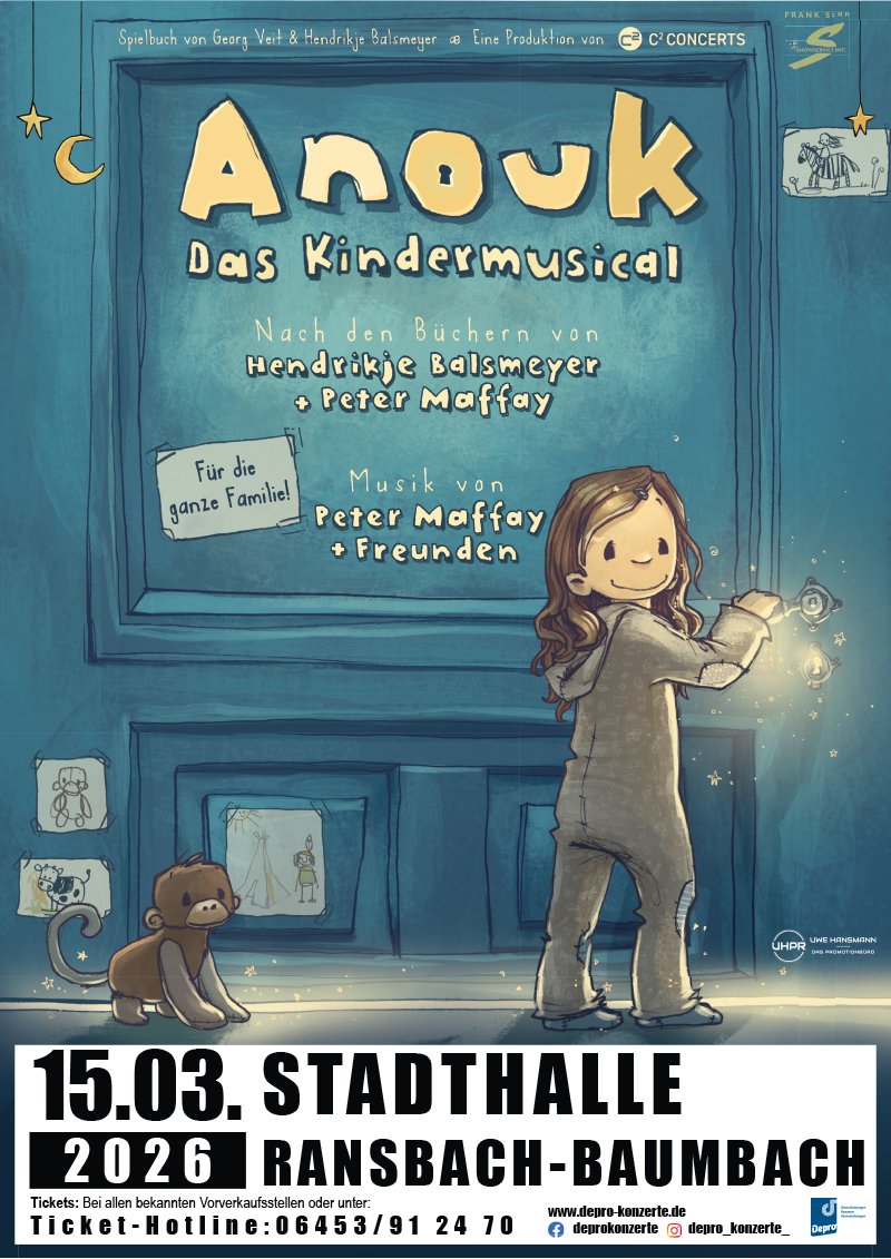 ANOUK – Das Kindermusical entführt große und kleine Entdecker in eine fantasievolle Welt voller Abenteuer, in der alles möglich scheint. Mit ihren Charakteren und faszinierenden Schauplätzen beflügelt die Bühnenadaption die Vorstellungskraft und stärkt den Glauben an die Kraft der Träume. Das Spielbuch stammt aus der Feder von Georg Veit und Hendrikje Balsmeyer, während Peter Maffay und sein Team für die musikalische Gestaltung verantwortlich sind. Als Herzstück des Musicals werden zehn mitreißende und niveauvolle Kinderlieder von Peter Maffay & Freunden entstehen, die zum Großteil eigens für diese Produktion komponiert werden und zur einzigartigen Atmosphäre beitragen.