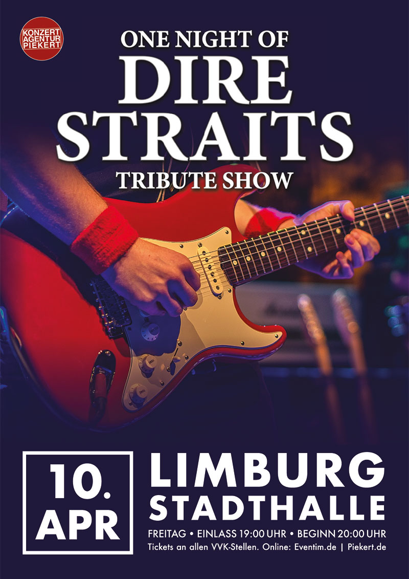 Diese finale Phase steht nun 30 Jahre später im Mittelpunkt der Tribute Show „One Night of Dire Straits“. Gitarrist und Sänger Alex Moll nimmt zusammen mit seiner exquisit besetzten Band von Live- und Studiomusikern den Zuschauer mit auf eine Reise voll faszinierender und handgemachter Musik. Mit einer Songauswahl, die nichts vermissen lässt, garantiert „One Night of Dire Straits“ einen herausragenden Konzertabend für alle Fans von Mark Knopfler, den Dire Straits und handgemachter Musik, die sofort ins Ohr geht.