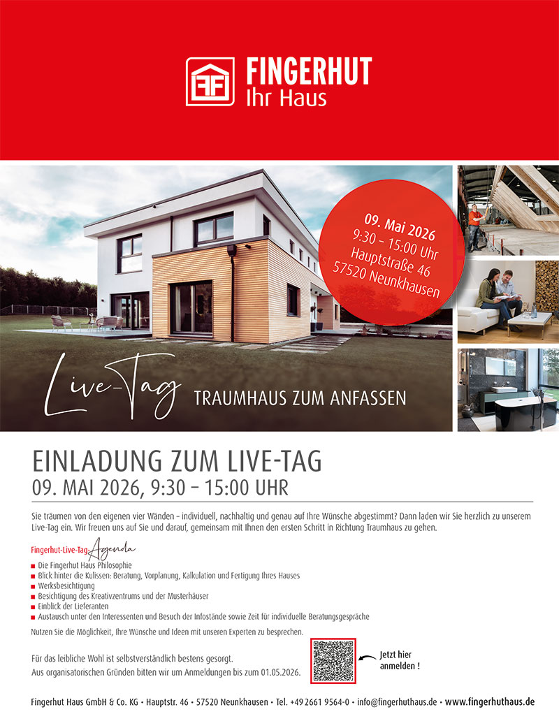 Sie träumen von den eigenen vier Wänden – individuell, nachhaltig und genau auf Ihre Wünsche abgestimmt? Dann laden wir Sie herzlich zu unserem Live-Tag ein. Wir freuen uns auf Sie und darauf, gemeinsam mit Ihnen den ersten Schritt in Richtung Traumhaus zu gehen …