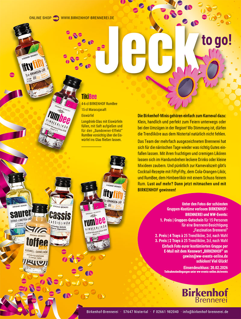 Das Team der mehrfach ausgezeichneten Brennerei hat sich für die närrischen Tage wieder was richtig Gutes einfallen lassen. Mit ihren fruchtigen und cremigen Likören lassen sich im Handumdrehen leckere Drinks oder kleine Mixideen zaubern. Und pünktlich zur Karnevalszeit gibt’s Cocktail-Rezepte mit FiftyFifty, dem Cola-Orangen-Likör, und RumBee, dem Himbeerlikör mit einem Schuss feinem Rum. Lust auf mehr? Dann jetzt mitmachen und mit BIRKENHOF gewinnen!